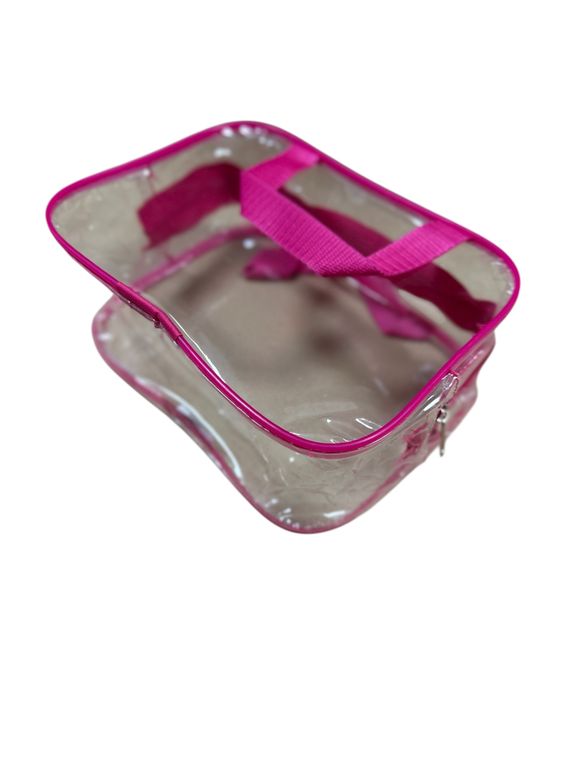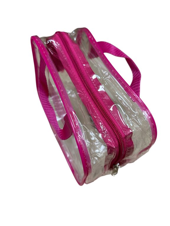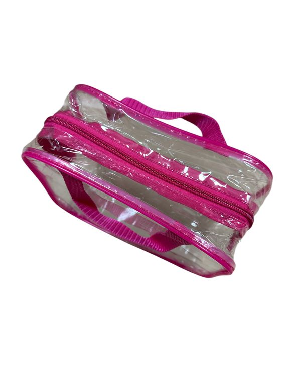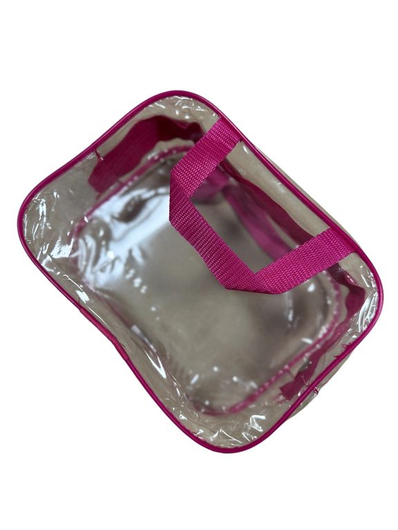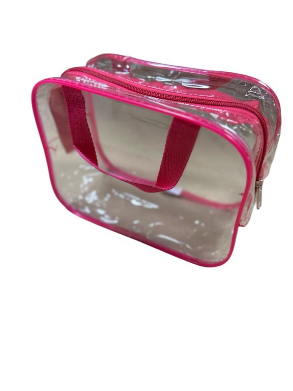 Хотите взять с собой всё самое необходимое в поездке? Представляем набор из 3 ярких и стильных косметичек из прозрачной плёнки ПВХ с розовой отделкой!